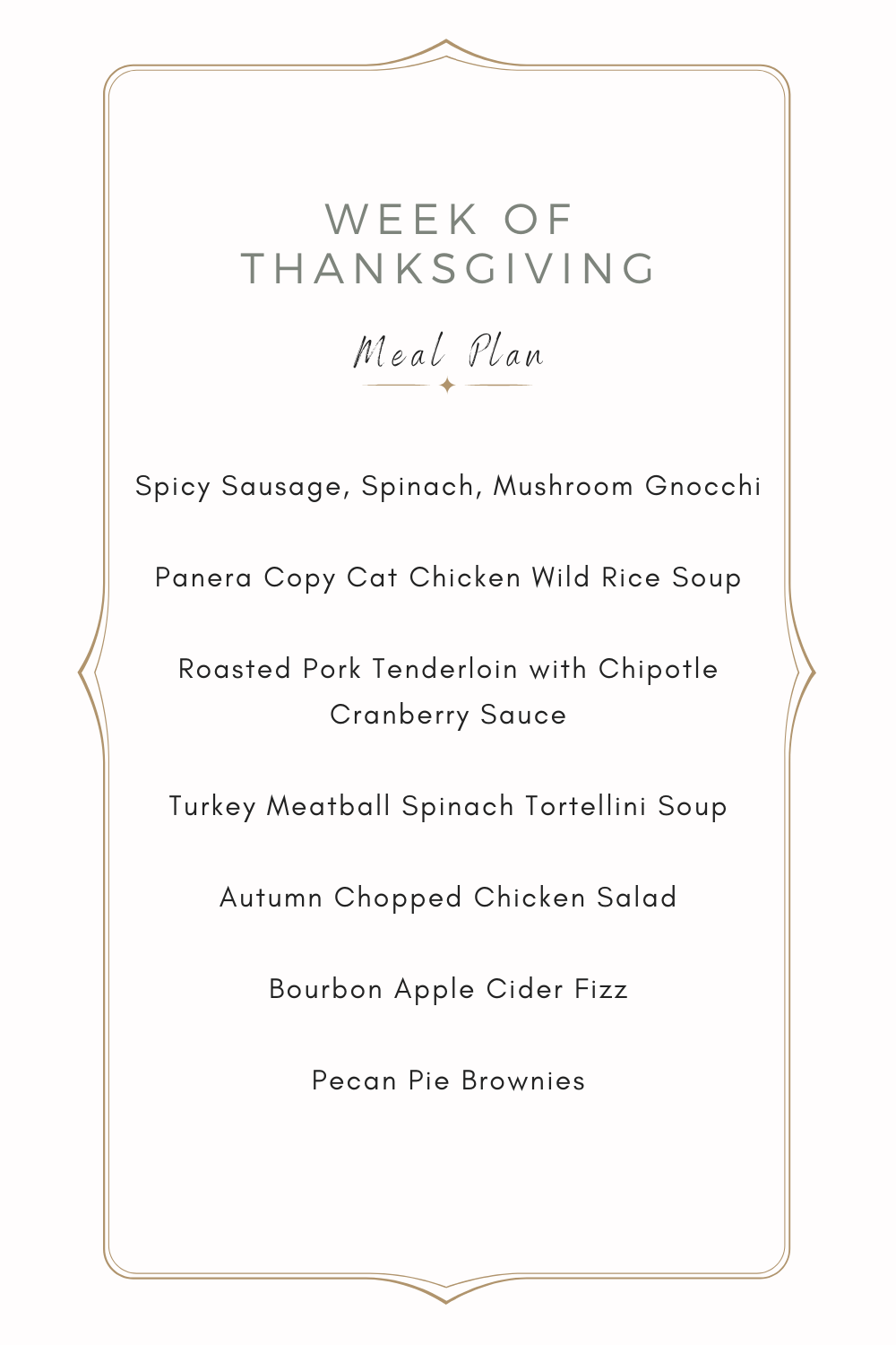 A Week of Thanksgiving Meal Plan because in case you hadn’t noticed, next week is Thanksgiving. I’m typically in the camp of grumps that get crabby when my beloved Thanksgiving gets overlooked, but I am also like most of you that think this year everyone deserves a free pass to just be. Even so, if the Christmas tree is already lit there’s still no harm in partaking in a little Thanksgiving dressing and spiked cider.
