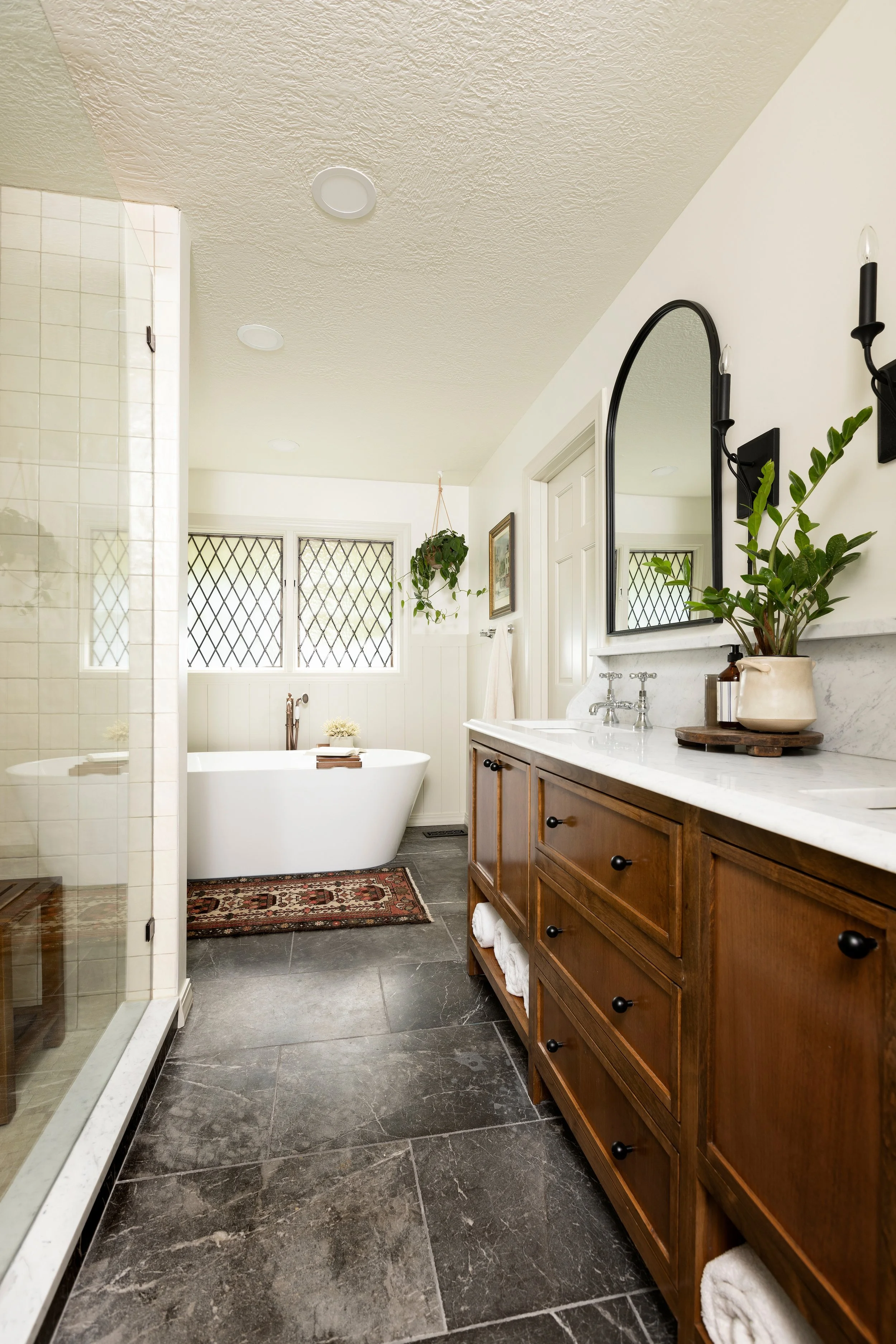 How do you turn a builder-grade bathroom into a dream bathroom? Why, with a generously sized soaking tub, a large shower, a custom vanity with open storage, a countertop with a built-in shelf, and a stained-glass window, of course! We gave our client all of these items from her wish list and so much more as we took this bath all the way from blah to beautiful.